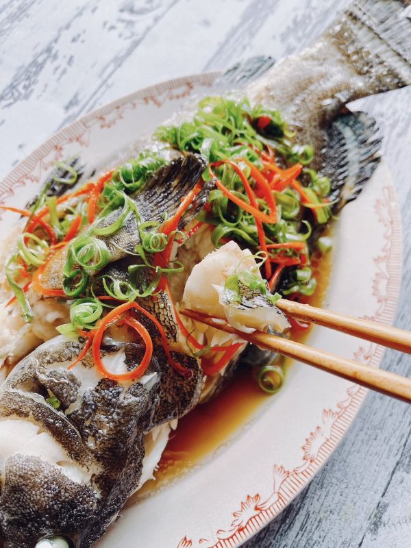 龍虎斑解凍後請先用清水清洗魚身,把切好的薑片(約2片)及蔥段(少許)放上魚身擺盤,入鍋大火隔水加熱蒸約12~13分鐘即可,起鍋後再把加熱好的魚露汁淋上即可上桌!